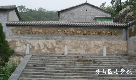 《没有共产党就没有新中国》纪念馆,位于北京西南霞云岭乡堂上村,是著名革命老区。《没有共产党就没有新中国》这首脍炙人口的红色圣歌就诞生在该村。2001年江泽民总书记在创作地亲笔题词“没有共产党就没有新中国”。2002年3月词曲创作地纪念馆被列为市级爱国主义教育基地,并举行了接牌仪式,极大地提升了教育基地知名度,使基地教育和传承革命传统的作用更加突出。此后,前来观光的旅游的游客络绎不绝,他们或在此重温入党誓词过组织生活,或在此游览山川胜景,或再次引吭高歌,抒发爱党爱国豪情,爱国主义教育基地的作用得到了较好的发挥。纪念馆总建筑面积1800平方米,分A、B、C三个区域,并建有4000平方米的红色歌曲船厂大舞台和1100平方米的大型主题展览,综合运用文字、摄影、绘画、浮雕、蜡像、幻影成像等传统与现代艺术手段体现主题。全部展览包括:800张照片、1幅油画、1幅大型浮雕、1尊蜡像、1幅幻影成像。